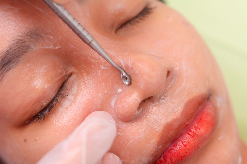 Manual extraction of blackheads and whiteheads under sterile conditions to prevent acne flare-ups and keep pores clean.